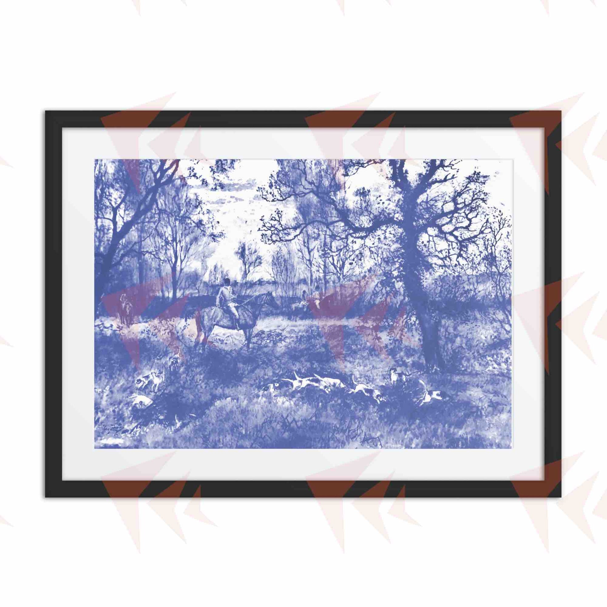 The rider pauses on horseback to watch the dogs' pursuit. Black frame. Acrylite front protector. 18"x24"